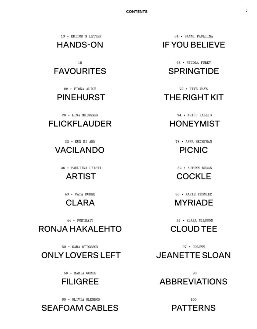 In the articles, we meet Finnish knitwear designer Ronja Hakalehto, who balances a busy family life in a small village near the Arctic Circle while drawing inspiration from wild nature and solitude. We also visit the beloved Stephen & Penelope yarn shop in Amsterdam and find style inspiration with Aleksandra Solowianiuk.