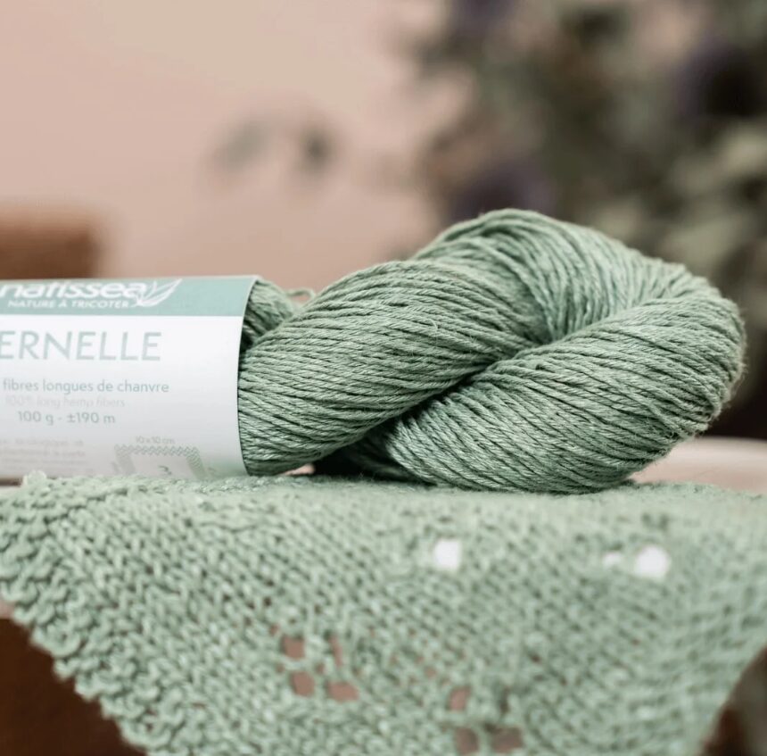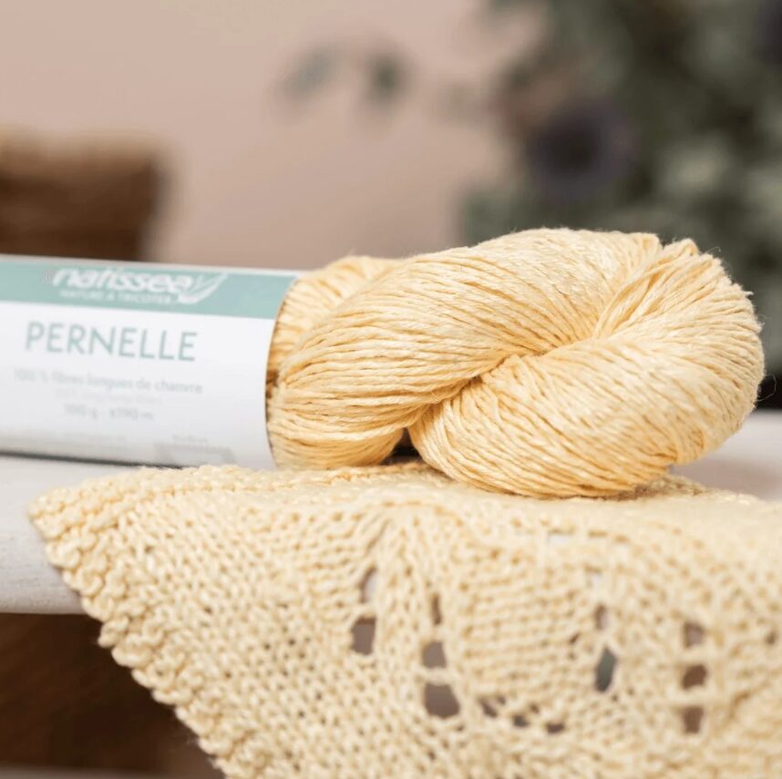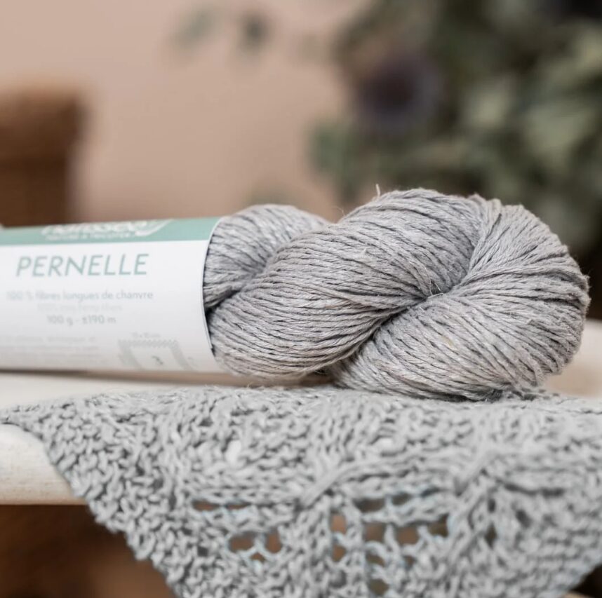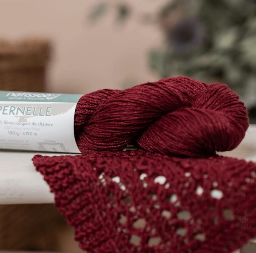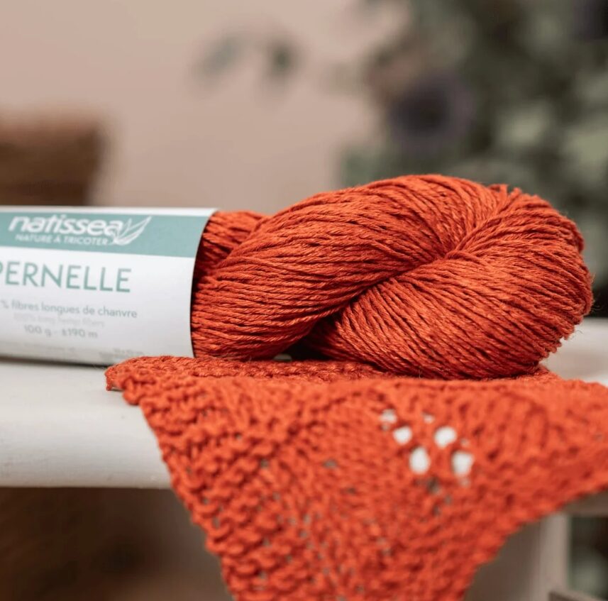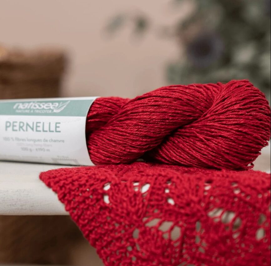 Pernelle yarn is made from long, high-quality hemp fibres, giving it a natural shine and authentic drape. It is ecologically dyed with GOTS-certified pigments in the North of France. It is not chemically softened. The “natural” colour is undyed; it is raw hemp yarn; its colour will vary depending on the seasons and sunlight levels. It will soften very quickly during knitting and the first soaking without warping or stretching. It is a yarn that softens and develops a patina over time, like washed linen. Its cultivation is very ecological because it requires neither fertiliser nor additional irrigation.