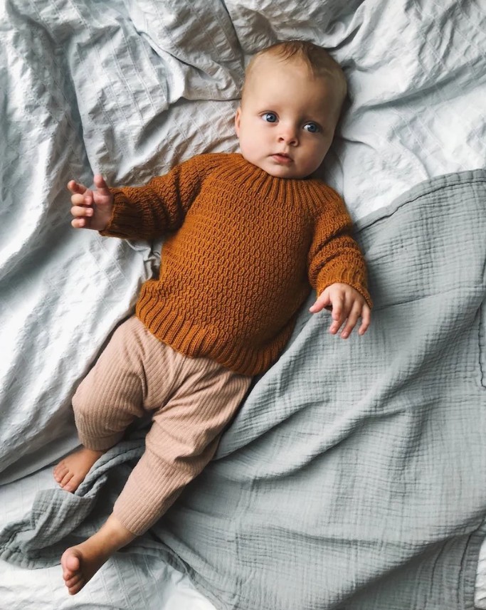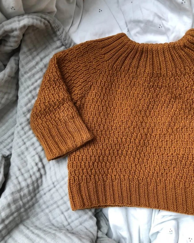 Alfred’s Sweater is worked top-down seamless on circular needles. The beginning of the yoke is knit in 2×2 ribbing without raglan increases. The top is then folded over to create a casing or hem (like a short tube) where the elastic band will be placed. Then, the rest of the yoke is worked with raglan increases.