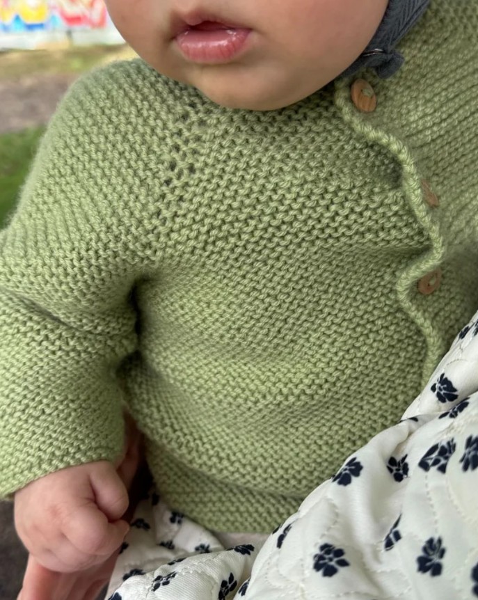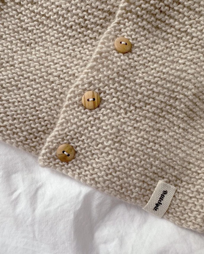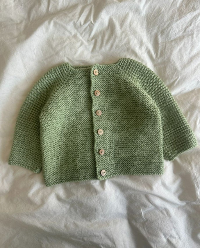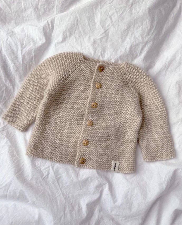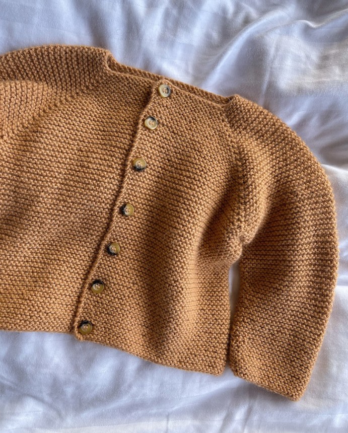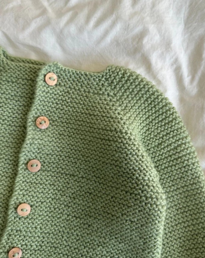 The Beginner’s Jacket is worked back and forth in garter stitch from the top down. First the yoke is worked, then the body and then the sleeves. The sleeves are also worked back and forth and then sewn together along the inside at the end.