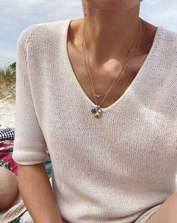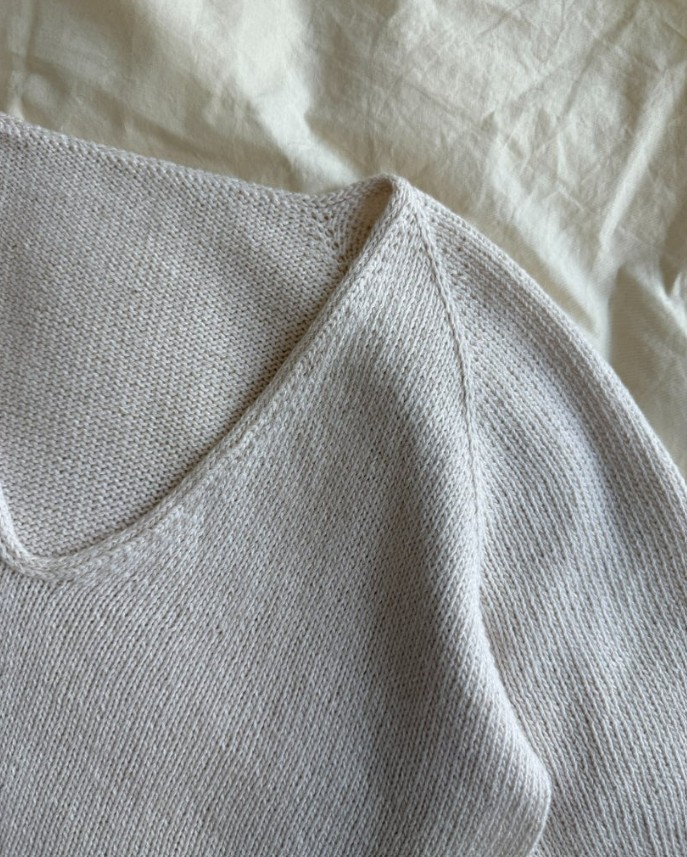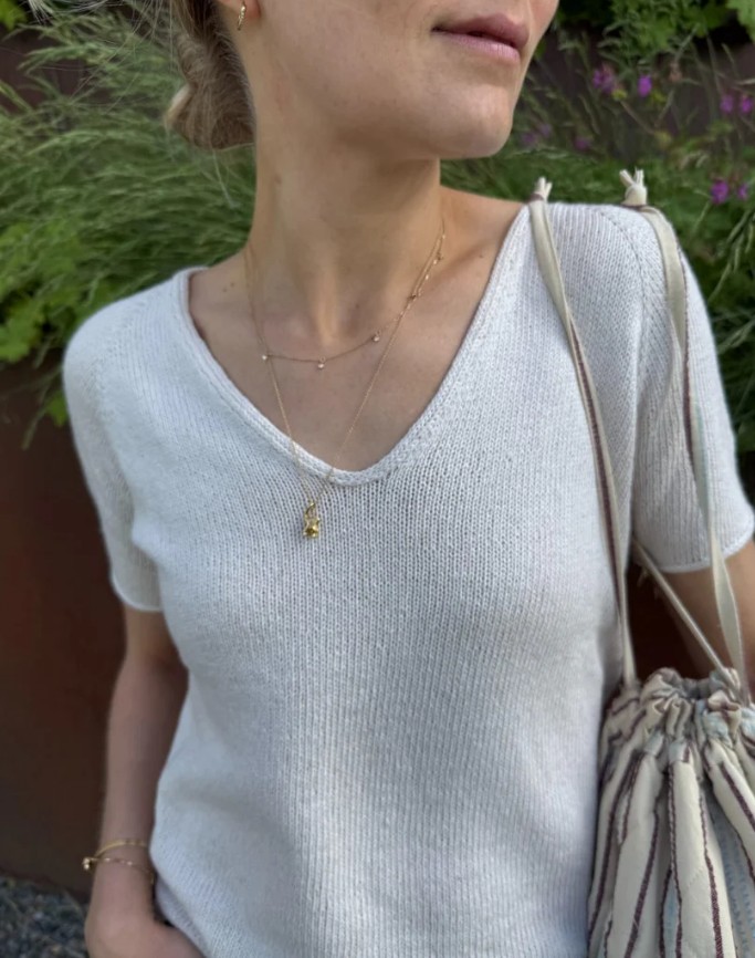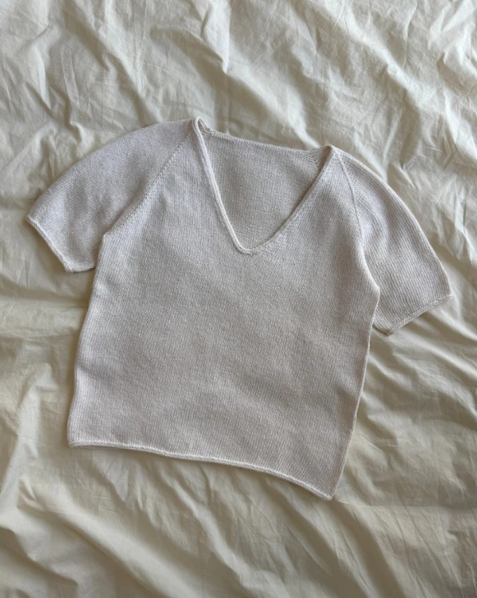 The Cumulus Tee is worked in stockinette stitch and has a rounded V-neck in the front. The sleeves are elbow length, and all edges are finished in i-cord. The Cumulus Tee requires no finishing work at the end.