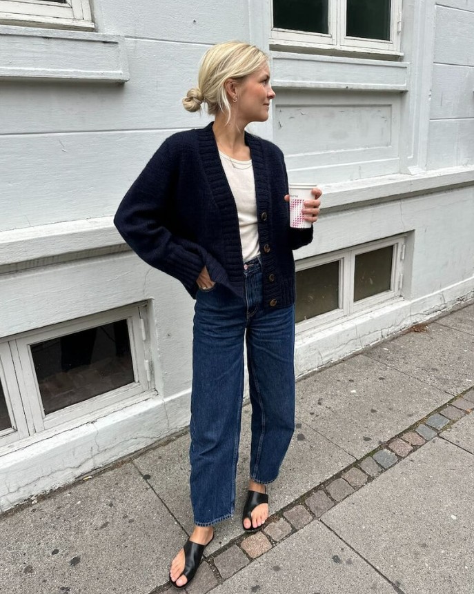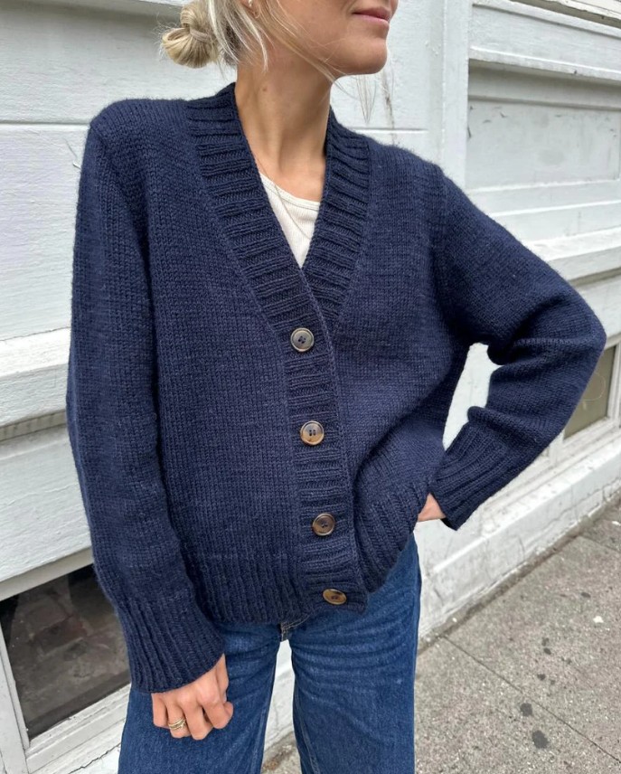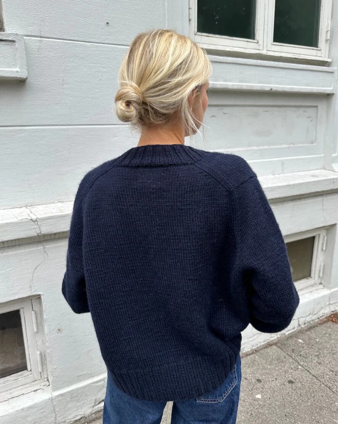 The Eva Cardigan is worked from the top down. First, the top part of the back yoke is worked back and forth with increases, then the shoulders are worked from stitches that are picked up and knitted along the top of the back yoke. Stitches are then picked up and knitted along the shoulders, and the rest of the yoke is joined on a circular needle and worked with increases for the V-neck. The rest of the body is worked back and forth on a circular needle, and the sleeves are worked in the round. At the end, stitches are picked up and knitted along the front edges and a wide front placket is worked in 2 x 2 rib.