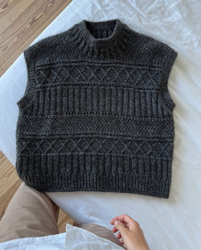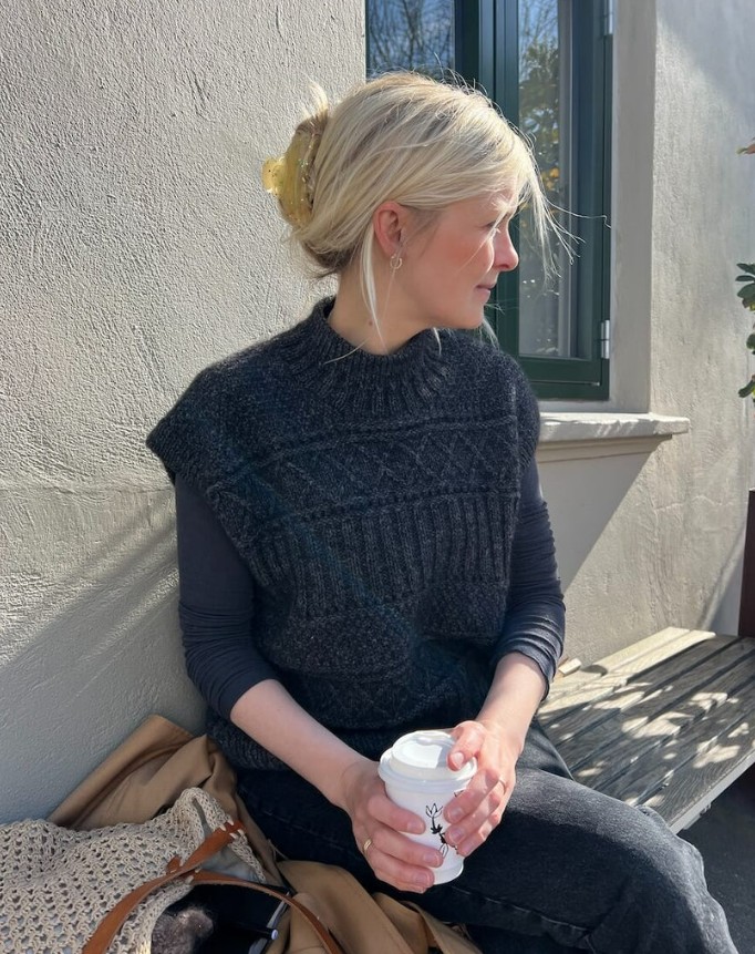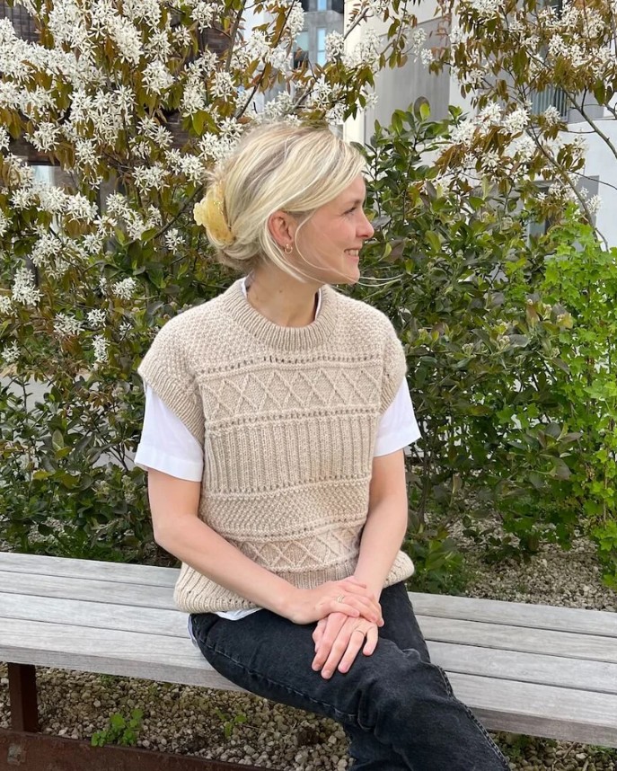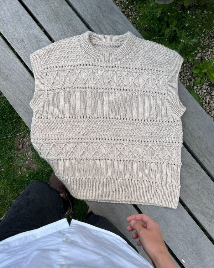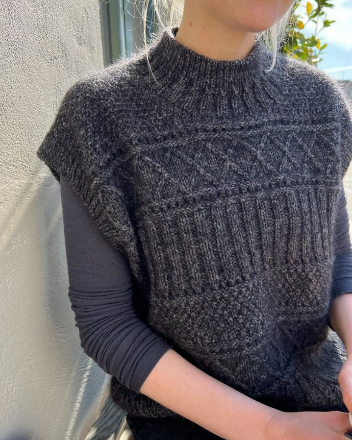 The Ingrid Slipover is worked from the top down in a knit and purl texture pattern. First, the back yoke is worked back and forth and the sloping shoulders are shaped using short rows. Then stitches are picked up and knitted for the shoulders, which are worked separately and then joined to form the front yoke. The front and back yoke are joined at the underarms to form the body, which is worked straight down in the round. Rib edges are worked along the armhole openings and at the neck. The Ingrid Slipover is worked in a texture pattern, which consists of three different pattern sections, each one separated by an eyelet section.