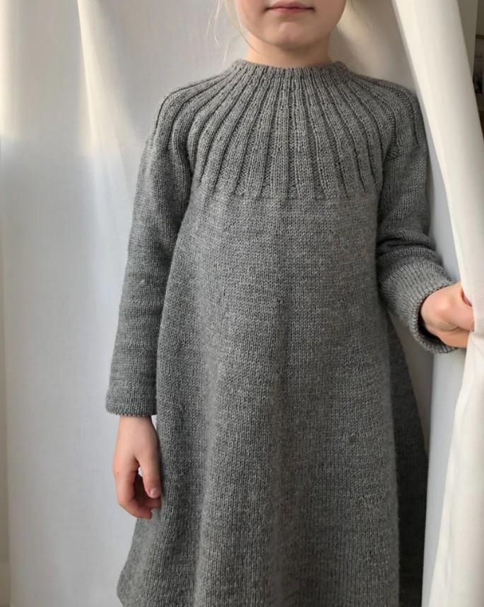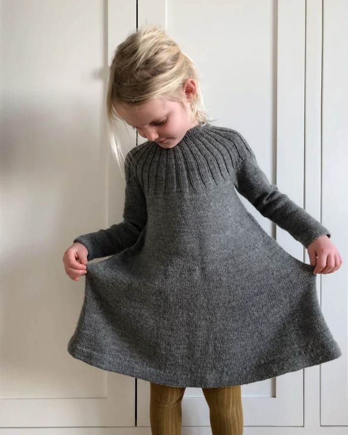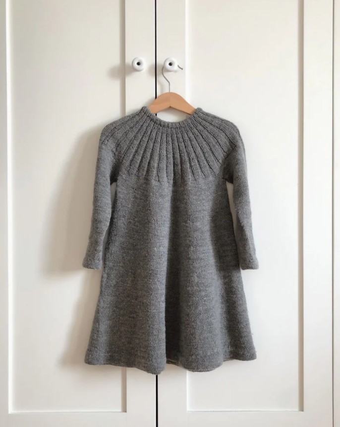 Sunday Dress is knit from the top down. The yoke is knit in the round with in and shaped with increases. Body, skirt and sleeves are knit in stockinette stitch and finished with a folded edge. The neckband is also folded over and sewn to the wrong side with an elastic thread inside – this makes the neckband easy to get over the head while ensuring it keeps its shape with wear. Sunday Dress has a neat A-line shape.