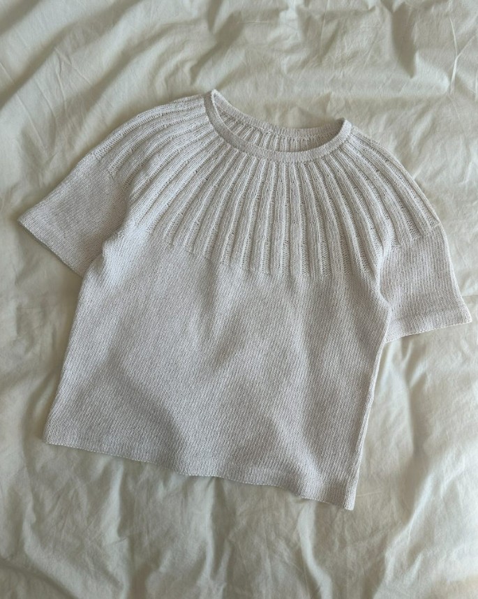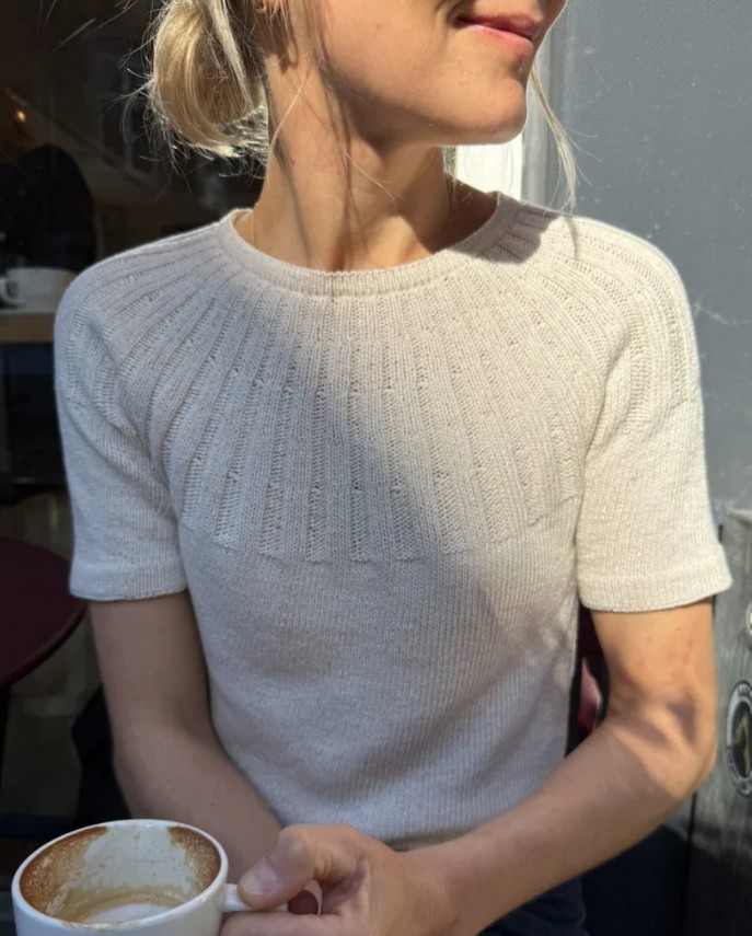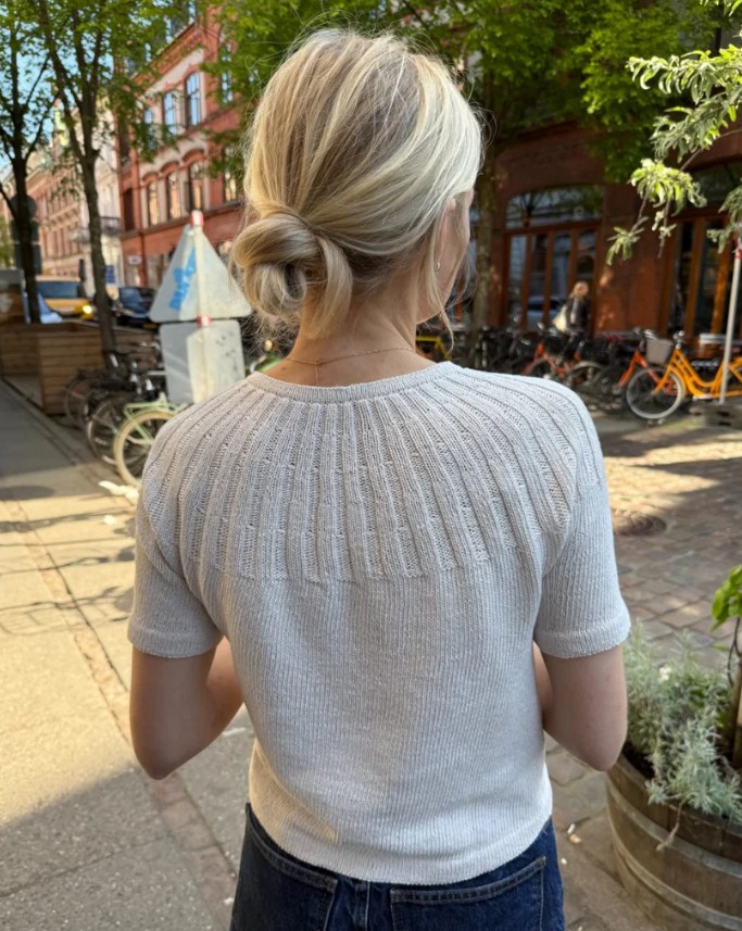 The Sunday Tee is knit from the top down. The circular yoke is worked in the round in rib pattern, shaped with increases. Short rows are worked after the yoke has been completed to raise the back. Body and sleeves are worked in the round in stockinette stitch and are finished with a folded edge.