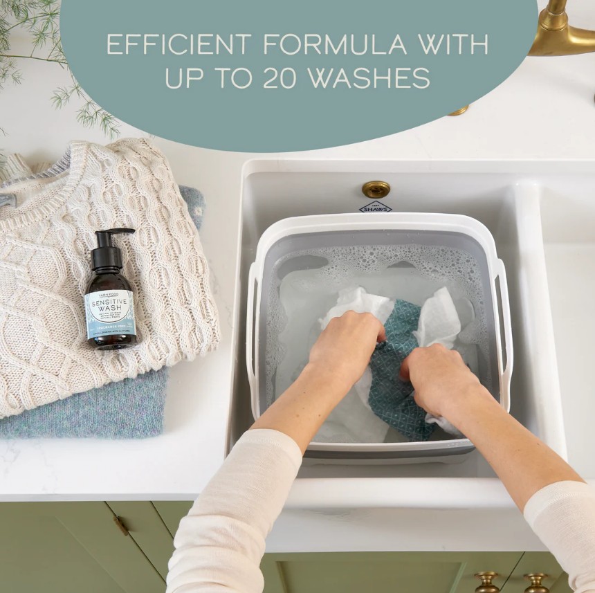 HOW TO USE Fill a sink or basin with one gallon, or 4.5 litres, of cold or lukewarm water. Add 3 pumps (5 ml) of Yarn Food Sensitive Wash and soak your garment for 20 minutes. Gently remove from the water, squeeze without wringing, and roll up in a towel to squeeze the remaining water out. Lay flat or block to dry. Washing machine: Suitable for regular or HE machines. Add 9 pumps (15ml) into detergent drawer or directly into the machine. Wash on wool or delicate cycle following your yarn’s care instructions.