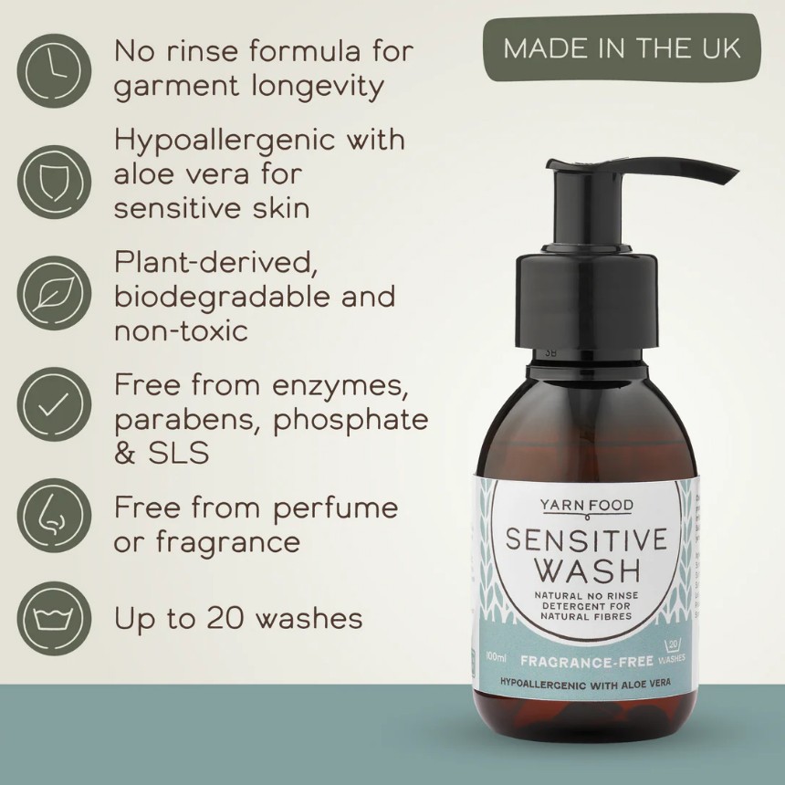 Yarn Food hypoallergenic Sensitive Wash no-rinse detergent with aloe vera is expertly designed for yarn crafters to clean, nourish and preserve yarn fibres naturally without irritating sensitive skin.