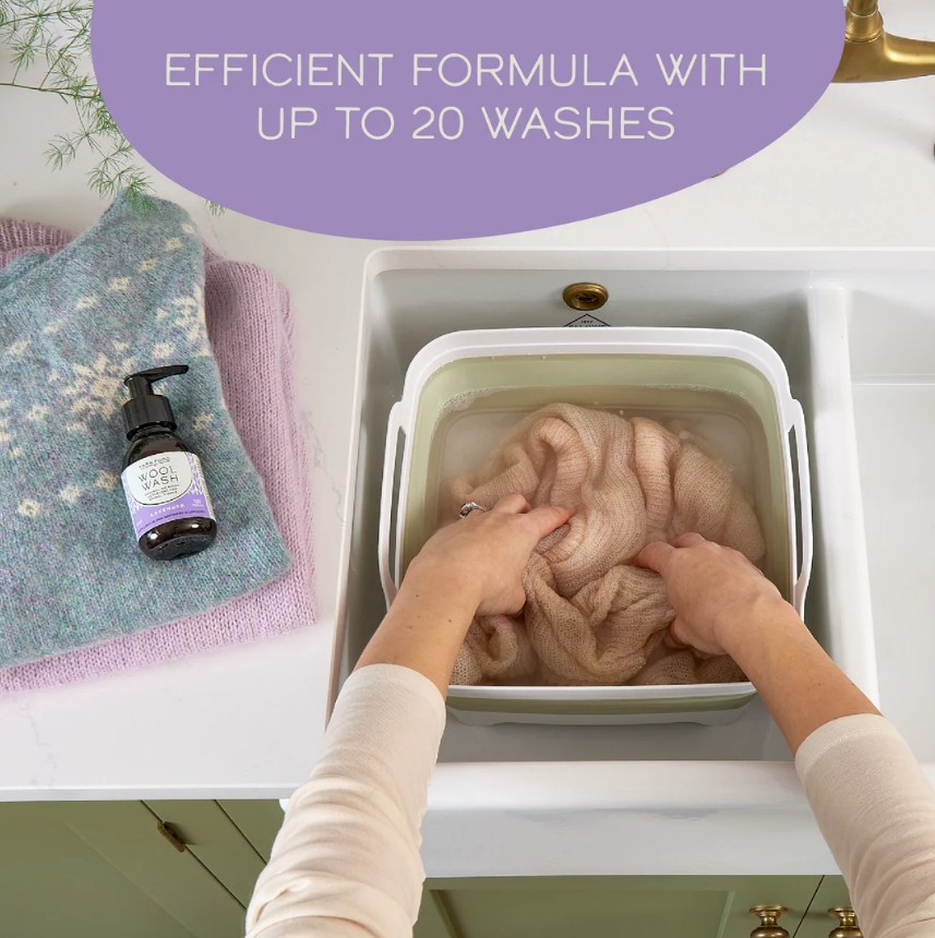 HOW TO USE Fill a sink or basin with one gallon, or 4.5 litres, of cold or lukewarm water. Add 3 pumps (5 ml) of Yarn Food Wool Wash and soak your garment for 20 minutes. Gently remove from the water, squeeze without wringing, and roll up in a towel to squeeze the remaining water out. Lay flat or block to dry. Washing machine: Suitable for regular or HE machines. Add 9 pumps (15ml) into detergent drawer or directly into the machine. Wash on wool or delicate cycle following your yarn’s care instructions.