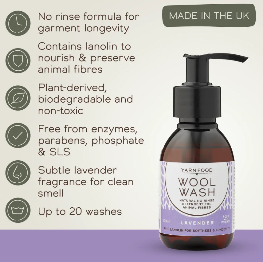 Yarn Food added lanolin to their natural no-rinse formula to feed moisture back into your woollies and animal fibre knitwear made from merino, cashmere, mohair, alpaca, angora, camel or other animal-based yarn fibres.